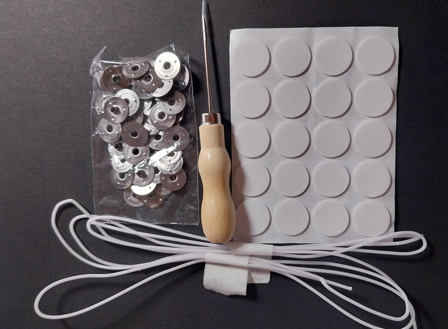 En Panchiscakes, te ofrecemos este combo que contiene: 2 metros de pabilo blanco talla s, 20 pegatinas, 50 chapas o porta pabilo y 1 aguja o punzón.